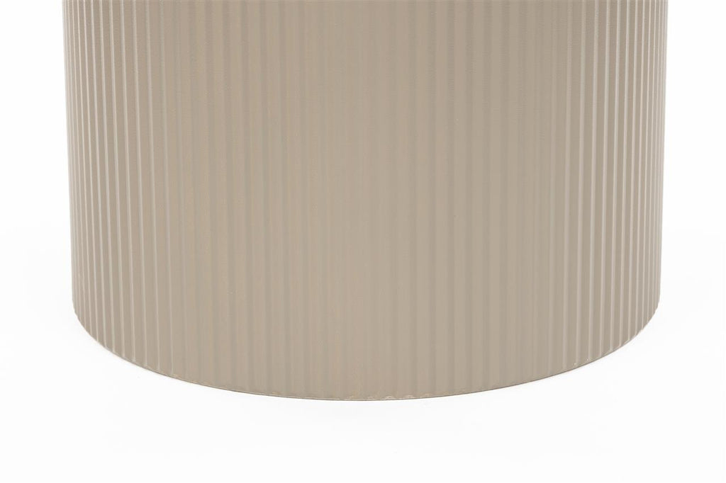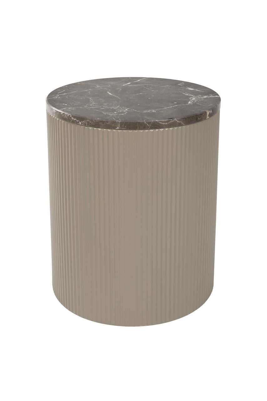 De Anna bijzettafel is de perfecte combinatie van materialen en kleuren. De cilindervormige basis is gemaakt van ijzer met een speels, geribbeld patroon. Door de afwerking met matte poedercoating in een neutrale kleurtint, loopt de onderkant perfect over in het marmeren tafelblad. Het gebruik van zowel natuursteen als ijzer geeft een mooi contrast, maar tegelijkertijd toch een rustige uitstraling.