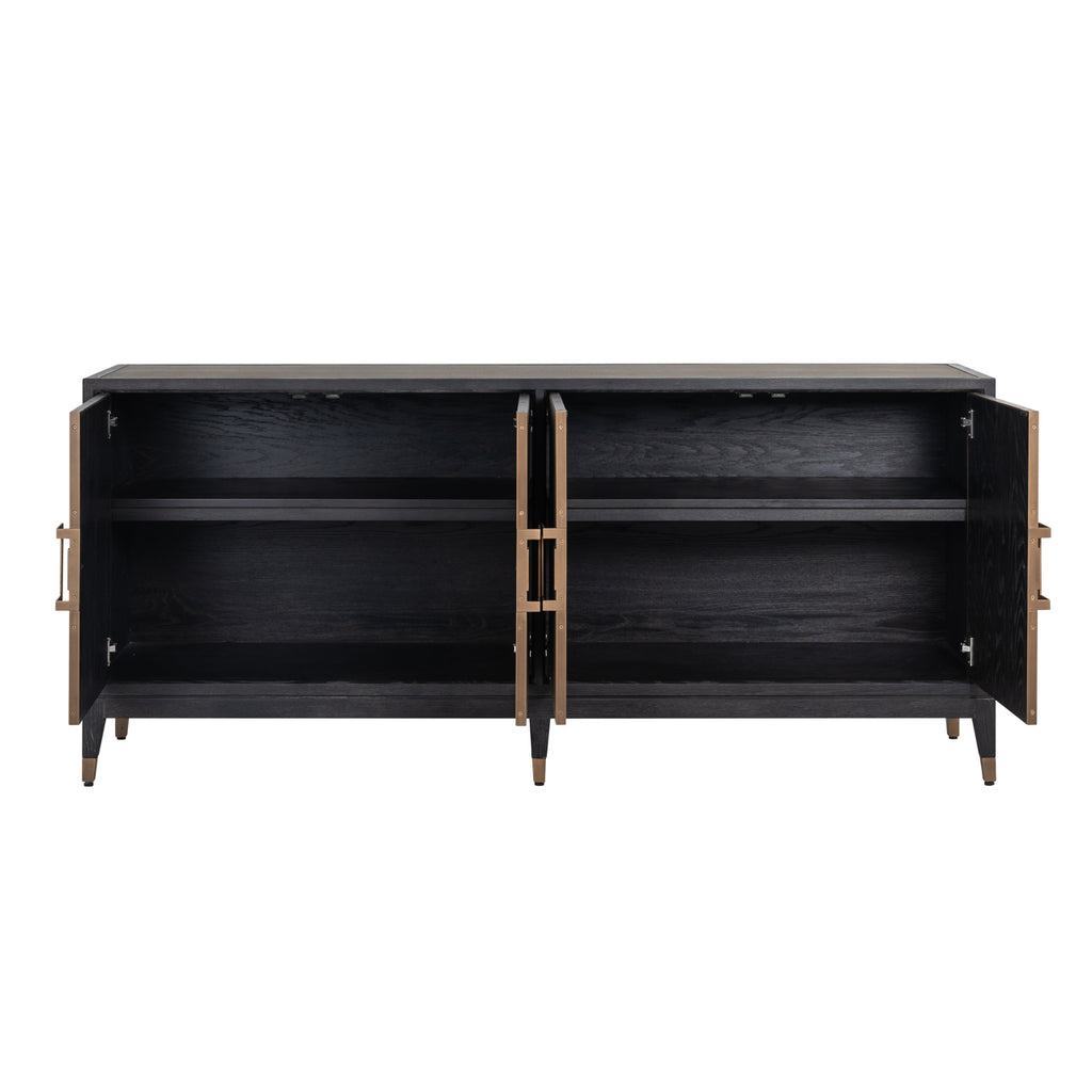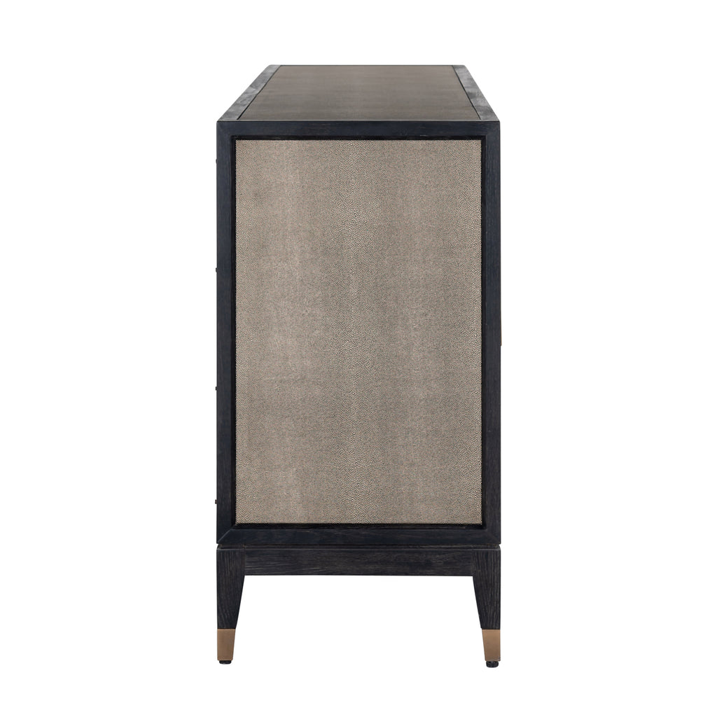 Dressoir Bloomville heeft vier deuren en biedt genoeg opbergruimte voor al je spullen! De Bloomville collectie is een verfijnde, luxe collectie gemaakt van segrijn / faux roggehuid van PU leer, zwart eiken en mat gouden details van metaal. Segrijn was populair in de Art Deco periode rond 1920 en geeft je moderne interieur een unieke touch!