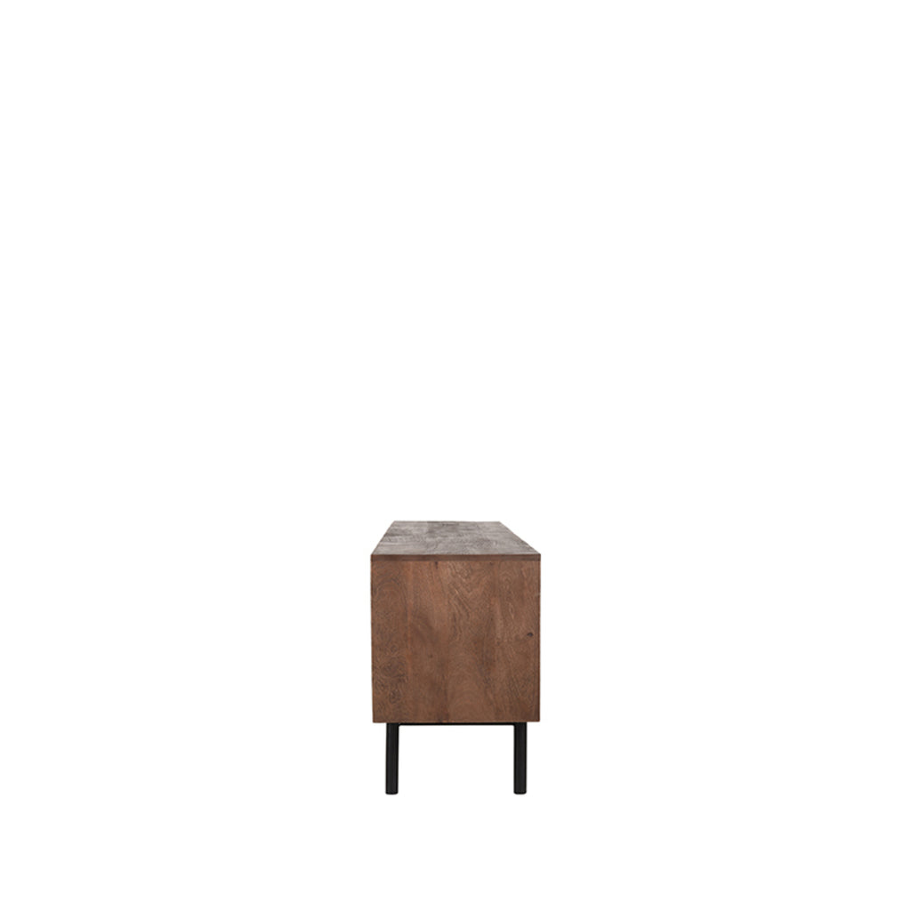 Deze fris ogende kast, uitgevoerd in de kleur espresso en voorzien van een licht gezandstraald oppervlak, is gemaakt van mangohout. Tv-Meubel Rio is voorzien van 3 deuren met hier achter ruimte opbergvakken. Achter het meest rechter deurtje, is de ruimte opgedeeld in twee vakken, om ook kleine tv-accessoires efficiënt op te bergen. Rio heeft rond uitgefreesde handgrepen die een prachtig onderdeel van de kast zijn. Rio heeft 5 zwarte metalen poten, waarvan de zijpoten zijn voorzien van een verbindingsframe. Het frame zorgt voor een bijzondere sterkte en extra stabiliteit.